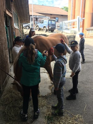 So konnten einige Schüler und Schülerinnen den Hühnerstall betreten und beim Eier holen helfen. Andere durften die Hühner füttern und wieder andere Kinder konnten mit Bürsten das Pferd putzen und striegeln. Weitere Kinder durften das Pferd füttern und Freiwillige beim Stall misten helfen. Zudem durften alle auf einem Traktor sitzen, Kraftfutter probieren und vieles mehr. Was Finn dazu meinte, war: „Es macht sooo Spass!“ Nebenbei erzählten Herr und Frau Rupp alles Wissenswerte über das Leben auf dem Bauernhof und darüber, was die Tiere brauchen.